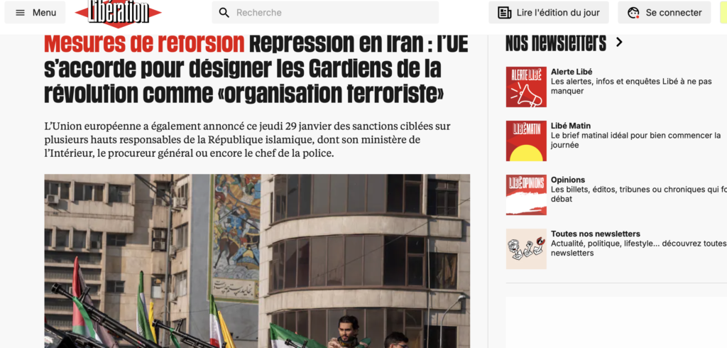 Par exemple, récemment, le quotidien Libération s’associe aux décisions de l’UE, contre des dirigeants iraniens.