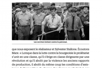 Cette note est entièrement consacrée à ce que le livre appelle « la conscience de classe chez Sylvester Stallone ». Ce titre implique l’existence et des classes sociales et d’une conscience de, puisque toute classe détermine, a minima, les consciences qui la composent, son auto-conscience d’elle-même, qu’elle soit lucide ou pas. La « conscience de classe chez Sylvester […]